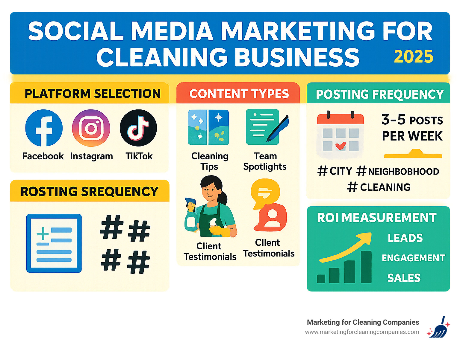 - Platform Selection: Facebook for local community building, Instagram for visual storytelling, TikTok for viral cleaning hacks